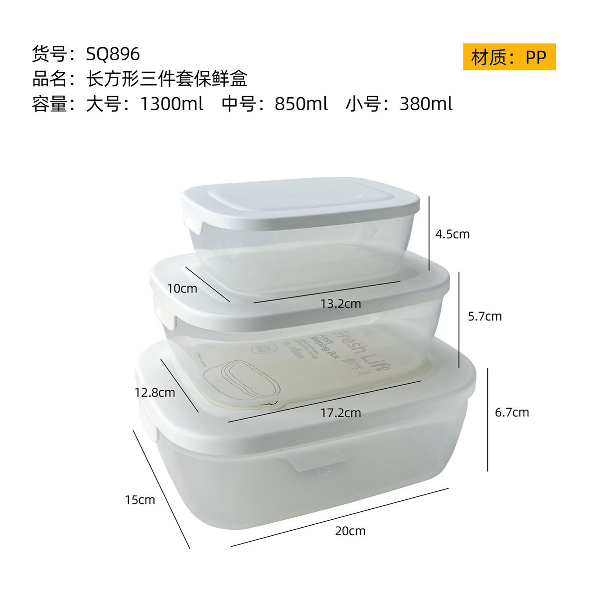 SQ-896(三件套):小號(hào):132*100*45mm/380ml 中號(hào):172*128*57mm/850ml 大號(hào):200*150*67mm/1300ml