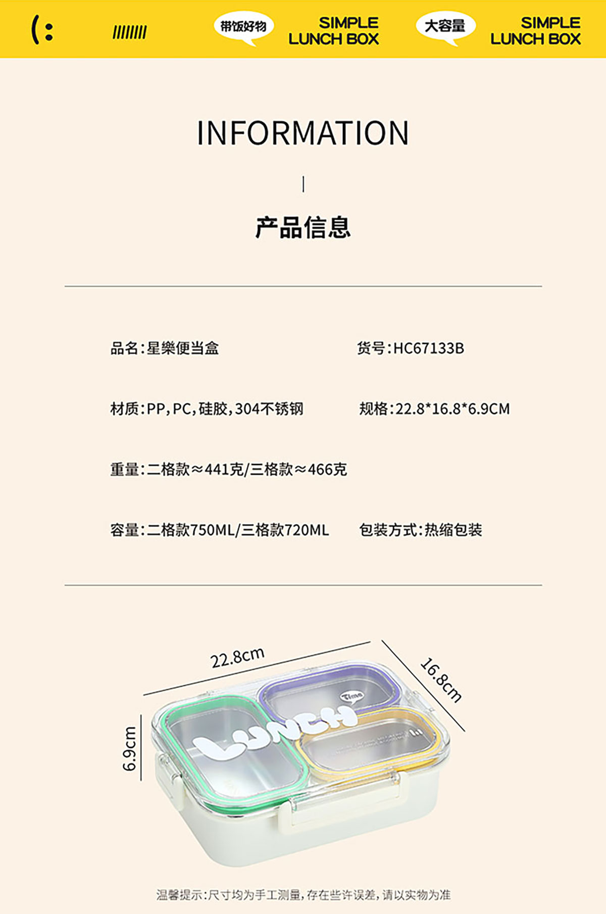 Size: 228*168*69mm(二格750ml/三格720ml)